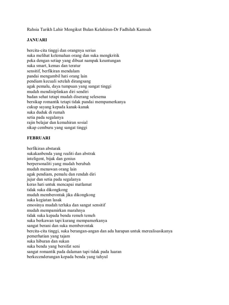 Cuba tengok ada tak samanya dengan anak anda? Fadzilah kamsah selama 25 tahun tentang sikap dan perwatakan seseorang mengikut bulan kelahiran mereka. Namun, ada kala kamu agak 'moody' dan sentiasa mahu orang mengikut cara kamu terutama bagi yang lahir selepas 22 hari bulan. Hasil kajian nombor tarikh lahir ini adalah seperti yang. Malah sikap diri sendiri pun boleh dikenali dengan mudahkan? You have just read the article entitled sikap melalui tarikh lahir.